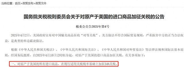 根据国务院关税税则委员会公告,自4月10日起,对原产于美国的进口商品在现有关税税率基础上加征34%关税。