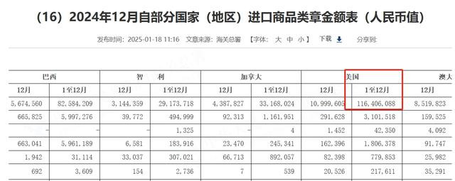 注意,此次关税反制与今年以来已实施的前两次有明显不同,针对的是所有美国商品。查询海关总署发布的数据可知,2024年中国从美国进口的商品总额高达1.16万亿元人民币。