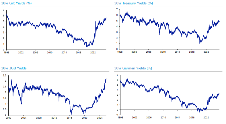 自8月底,全球长端债券抛售潮从欧洲大陆席卷而来。法国由于政府面临信任投票,市场对其财政紧缩计划的可行性产生怀疑。随后,英国因预算方案引发的担忧、日本因政局不稳可能导致的财政扩张预期,共同助推了这场风暴。