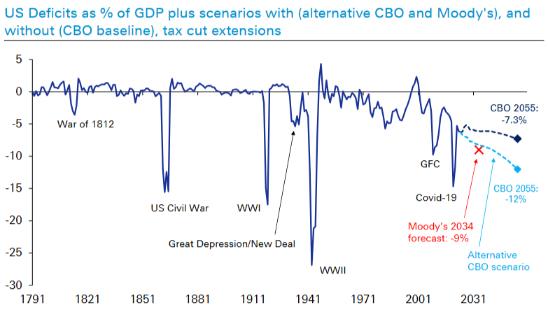 在美国,根据穆迪公司的预测,即便不考虑特朗普时期减税政策的延长,其财政赤字占GDP的比重也将在十年内升至9%。